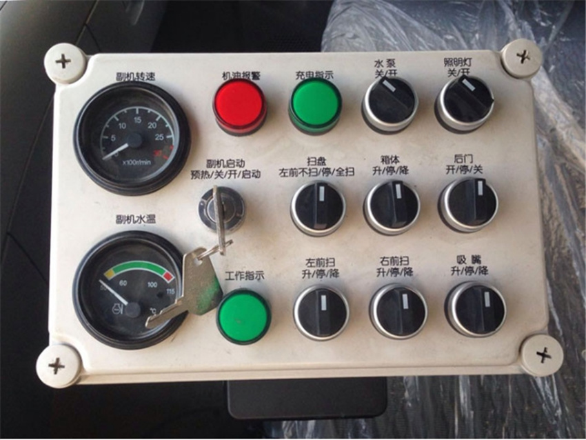 9,一鍵PLC操作控制面板設計,方便司機工作時,在駕駛室內就可以完成吸盤的收放,水路控制,垃圾傾倒和垃圾箱回位操作。