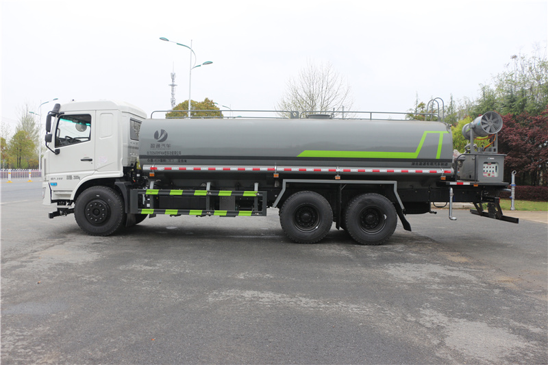 專底22方霧炮車_東風專底22方抑塵車_國六22方灑水車_湖北盈通專用汽車有限公司,該車用途為抑塵降霾.主要裝置為罐體及噴霧裝置;隨底盤選裝駕駛室,選裝噴霧裝置樣式,選裝底盤附件布局;罐體有效容積:20.2立方米;罐體外形尺寸(×長軸×短軸)(mm):6700×2450×1580;側、后防護材料均為:Q235碳鋼,連接方式均為:螺栓連接,后部防護截面尺寸(mm):120×50,后部防護離地高度(mm):460;ABS型號/生產廠家:3631010-C2000/東科克諾爾商用車制動系統(十堰)有限公司.采用4350+1350(mm)軸距.