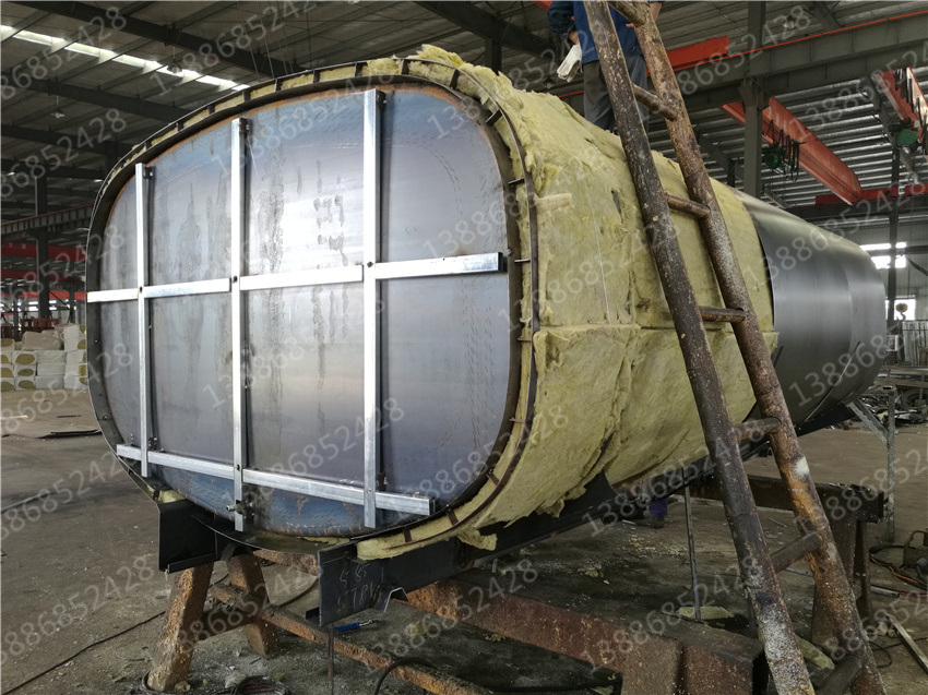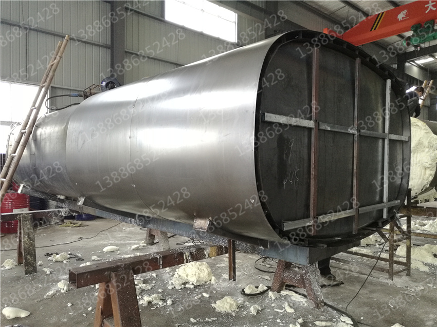 另一種則是聚氨脂材料發(fā)泡保溫。聚氨脂泡沫材料的填充是利用專門的發(fā)泡機械將化學(xué)生成的發(fā)泡體噴吐至罐體與骨架之間。噴吐時慢慢的堆積成型,這樣使泡沫材料更加嚴(yán)實。對于多余的或高于骨架外型表面的發(fā)泡體,利用鏟刀將其打磨。外表蒙上一層0.8mm厚的冷軋板,采用抽芯鉚釘將冷軋板固定在骨架上。