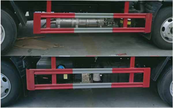 液壓尾板桶裝垃圾收集車|福田桶裝垃圾運輸車|藍牌桶裝垃圾車|時代藍牌垃圾收集車,該車用于桶裝垃圾收集轉運,專用裝置:貨廂和后尾板升降機構;液壓尾板收起狀態的水平長度為180mm;尾板質量為270kg;ABS型號為CM4XL-4S/4M,生產廠家為廣州瑞立科密汽車電子股份有限公司;側、后防護材料均為:Q235碳鋼,側防護連接方式為:螺栓連接,后防護連接方式為:焊接連接,后部防護截面尺寸(mm):100×50,后部防護離地高度(mm):400.選裝直接供電式ETC車載裝置;隨底盤選裝駕駛室.發動機/油耗值為(L/100km):Q23-115E60/11.12,Q23-115C60/11.31.僅采用底盤2850mm軸距改裝.該車型整備質量包含備胎、滅火器、隨車工具。選裝電瓶油箱位置。 |