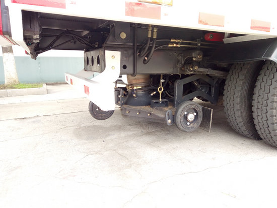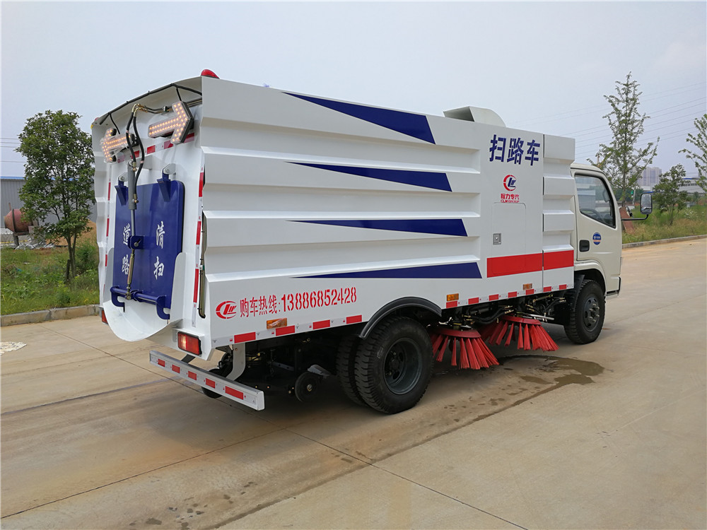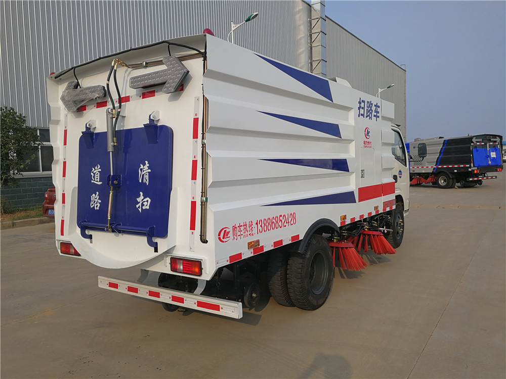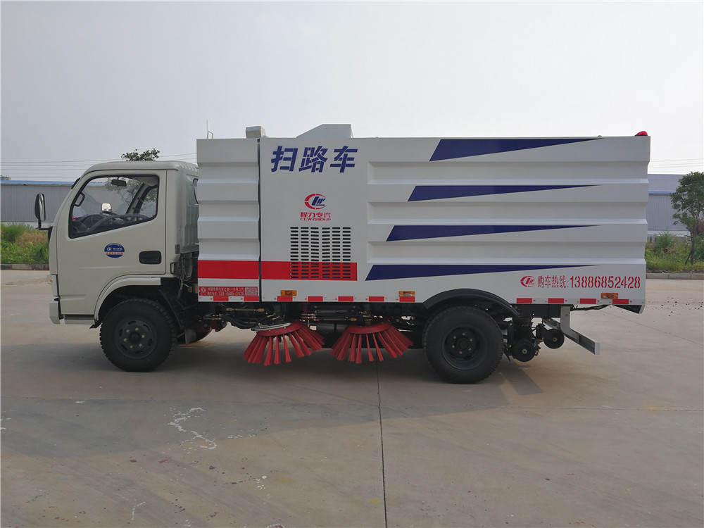 該掃路車采用東風(fēng)多利卡二類底盤改裝,加裝副發(fā)動機(jī)、風(fēng)機(jī)、清水箱、垃圾箱、左右立掃、掃盤降塵系統(tǒng),液壓系統(tǒng)、專用裝置電控系統(tǒng)和副車架等改裝而成。