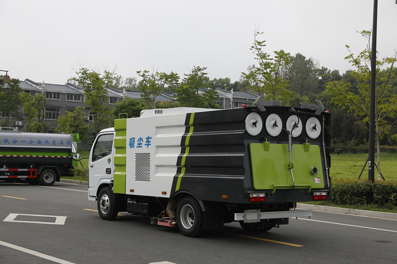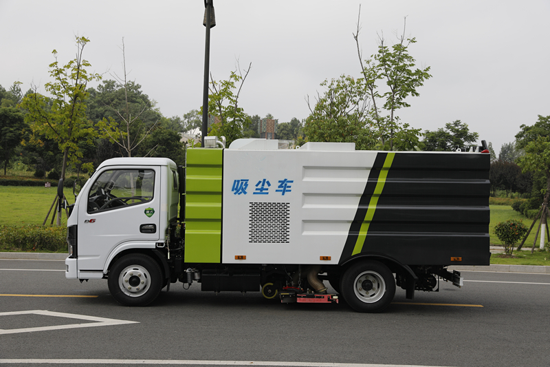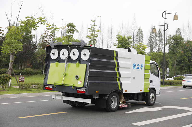 吸塵車垃圾箱上端裝有過(guò)濾系統(tǒng)和除塵